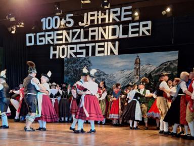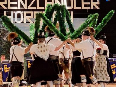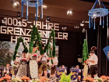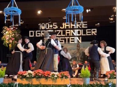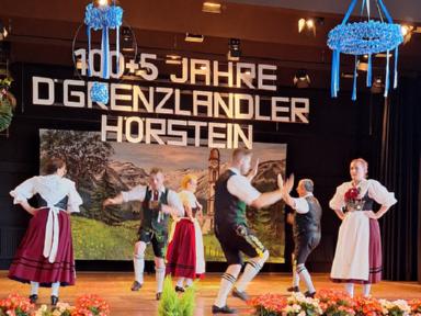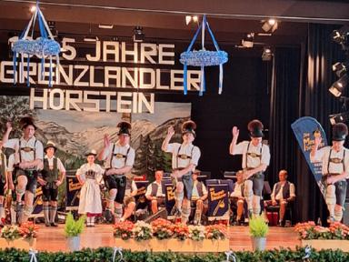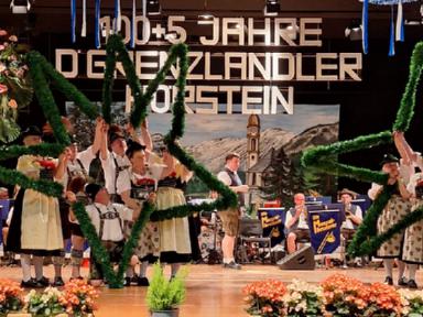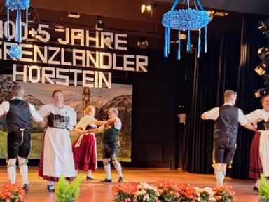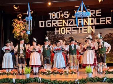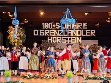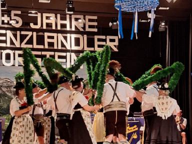 Zum Auftakt des Festprogrammes am Samstag, wurden alle Buam aufgerufen, gemeinsam den „Langschottisch“ zu platteln. Die Aktiven des Festvereins zeigten anschließend einen eigens für diese Veranstaltung einstudierten Schuhplattlertanz, den „Hörsteiner 100+5er“. Weitere Trachtentänze der anwesenden Vereine Glasofen aus dem Gauverband Unterfranken, Enzian Bruck aus dem Oberpfälzer Gauverband wurden aufgeführt. Das gekonnt dargebotene Glockenspiel der Heimbuchenthaler Musikanten und die Einlagen der Mainzer mit Ihrem Laubentanz und der Altenbucher Goaßler, waren besondere Programmpunkte. Ein Höhepunkt und Schmankerl im Verlauf des Heimatabends, war jedoch der gemeinsam von unseren Aktiven und den Aktiven aus Pirmasens aufgeführte Sterntanz. Gemeinsame Proben in unserem Probenraum im Bürgerhaus in Kirschhausen gingen dem Auftritt voraus. Hierzu wurde bereits separat berichtet.