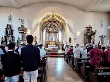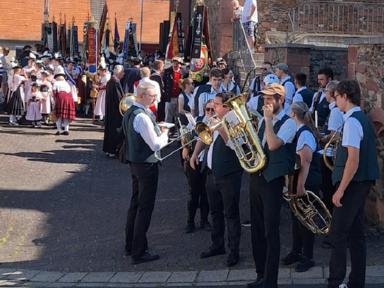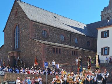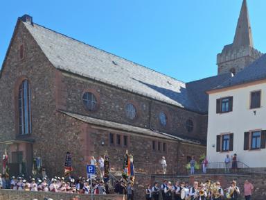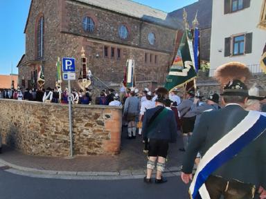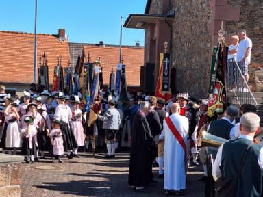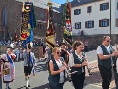 Zu Beginn des Festsonntages trafen sich schon früh am Morgen die Trachtenvereine mit Ihren Fahnenabordnungen auf dem Vorplatz des Hörsteiner Kindergartens. Verein für Verein marschierte sodann zu Kirche „Mariä Himmelfahrt“ zu einem ökumenischen Wortgottesdienst, bei dem auch drei neue Fahnenbänder geweiht wurden. Nach dem Gottesdienst wurde erneut Aufstellung genommen. Die Kirchenparade wurde angeführt vom Musikverein 1955 Hörstein e.V., der die anwesenden Trachtler mit Ihren Fahnenabordnungen mit zünftiger Marschmusik zur Festhalle begleitete. Mit Salutschüssen wurden die Teilnehmer des Kirchenzuges an der Räuschberghalle empfangen.