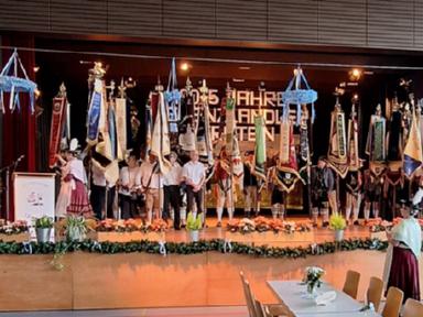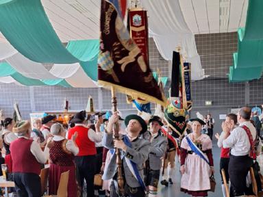 Nach einer kurzen Pause und nachdem die Mitglieder der anwesenden Trachtenvereine ihre Plätze eingenommen hatten, wurden die einzelnen Fahnenabordnungen in die Festhalle eingespielt. Jeder Verein wurde von Rosita Schaller, Vorständin des Trachtenvereins Hörstein, einzeln benannt und herzlich begrüßt. Alle Fahnenabordnungen nahmen auf der Bühne Aufstellung und präsentierten ihre Fahnen bei der Bayernhymne.