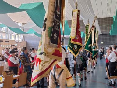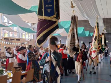 100+5. Jubiläum deshalb, da vor fünf Jahren die bereits geplante Festveranstaltung aufgrund der Pandemie abgesagt werden musste. Von voller Farbenpracht der toll geschmückten Festhalle, war die Veranstaltung nach gelungenen Vorbereitungen der Hörsteiner Trachtler geprägt, allerdings bei hochsommerlichen Temperaturen jenseits von 30° Celsius.