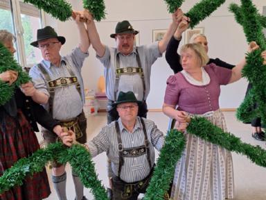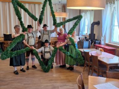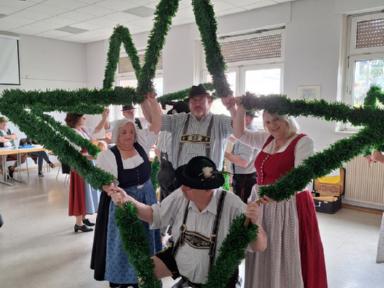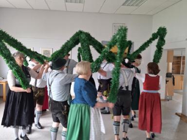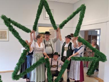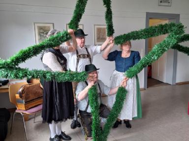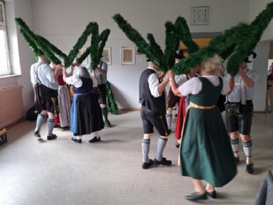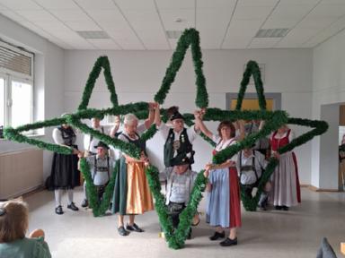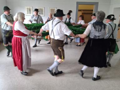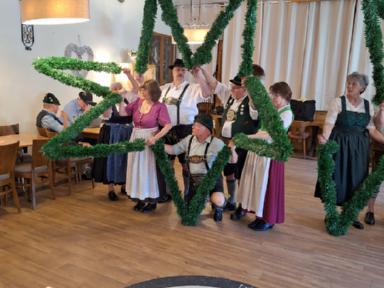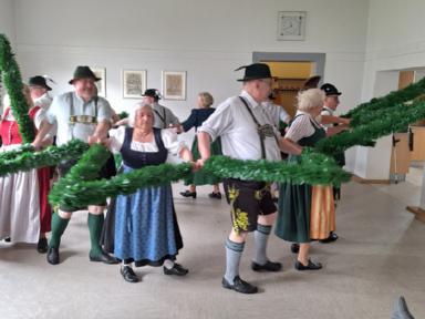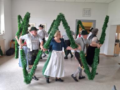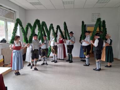 Gemeinsame Probentermine wurden vereinbart. Diese fanden ausschließlich in Heppenheim statt, da die Platzsituation für das Einstudieren des Sterntanzes hier am besten gegeben war. Unser Ehrenvorplattler Wolfgang Biereder hatte die einzelnen Figuren, sowie deren Reihenfolge zusammengestellt und den Aktiven beider Vereine vorab erklärt. Zunächst wurden die Tanzabschnitte ohne musikalische Begleitung probiert, danach mit musikalischer Begleitung durch die Vereinsmusikanten der Alpenrose Heppenheim. Von Probe zu Probe konnte man erkennen, dass sich die einzelnen Figuren des Sterntanzes in Ihrer Deutlichkeit und Perfektion verbesserten.