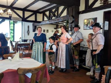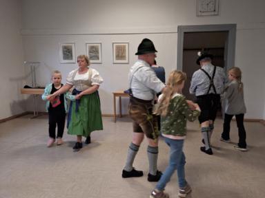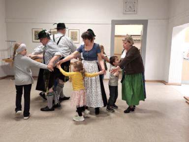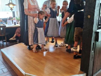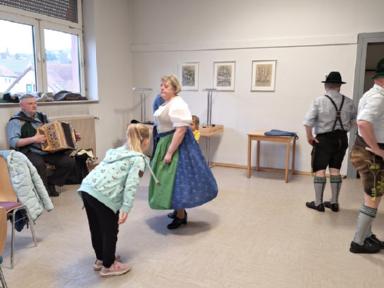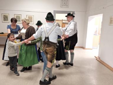 Tänze, aus dem letzten Jahr, wurden immer wieder geprobt und aufgefrischt, wie etwa das Bauernmadl, Hackespitze und ein Boarischer. Neue Tänze wie der Siebenschritt, die Kreuzpolka und zuletzt sogar das Mühlradl, kamen zum Repertoire hinzu. Beim Einstudieren des Mühlradl waren die Kleinen des Vereins mit Begeisterung und Eifer dabei, sodass diese Probe länger andauerte als sonst. Sie konnten gar nicht genug bekommen, von dem neu erlernten Figurentanz und forderten die Erwachsenen erneut zum Tanz auf. Zum Schluss der Kinderproben gibt es immer wieder ein Spiel, wie z.B: der Huterer oder die Reise nach Jerusalem. Beim Huterer stehen Stühle in einem Kreis und eine Person setzt einen Hut seinem Nachbarn auf den Kopf. Das Ganze natürlich mit musikalischer Begleitung. Hört die Musik auf zu spielen, scheidet eine Person aus, bis zum Schluss nur noch zwei Kinder übrigbleiben. Leider kann auch hier nur einer gewinnen. Ähnlich funktioniert die Reise nach Jerusalem, indem die Kinder um die im Kreis aufgestellten Stühle im Takt der Musik marschieren. Hört die Musik auf zu spielen, setzen sich schnellstmöglich alle auf einen freien Stuhl. Derjenige, der keinen Stuhl erwischt, scheidet aus und es wird ein Stuhl des Kreises reduziert, bis schließlich nur noch ein Stuhl und zwei Personen übrig sind.