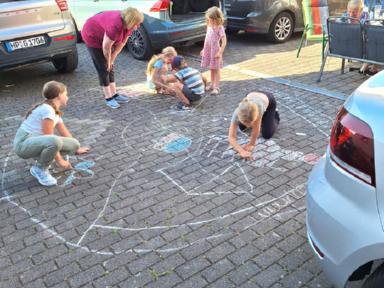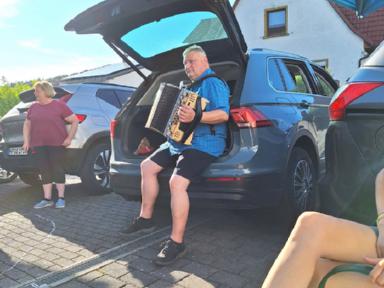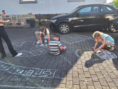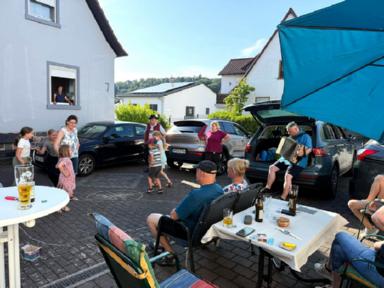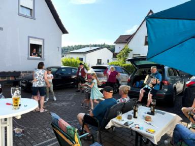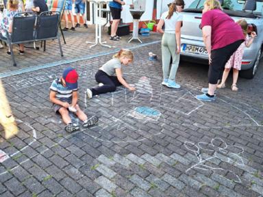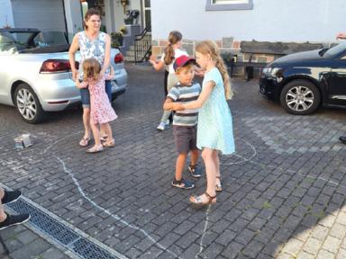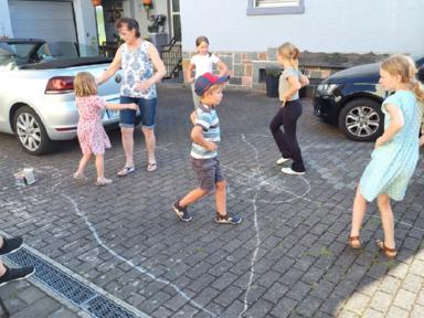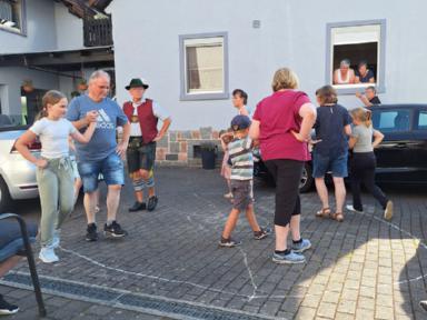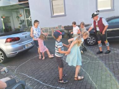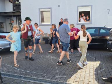 Die letzte Kinderprobe des ersten Halbjahres 2025 fand am 04. Juli 2025 auf dem Hof der Familie Dörsam in Kirschhausen statt. Unsere Jugendleiterin Rebecca Greifenberg hatte dazu eigens für die Kleinen eine Aufgabe erstellt. Sie mussten mit bunter Kreide einen Tanzkreis aufmalen mit dem Namen unseres Vereins und Symbolen unserer Vereinsfahne. Ziel der letzten Zusammenkunft im ersten Halbjahr war es, noch einmal vor der Sommerpause, die erlernten Tänze zu proben, da ja am nächsten Tag am 05. Juli 2025, unser zweiter Vorstand Paul Dörsam zu seinem 66. Geburtstag eingeladen hatte. Zu Beginn der Geburtstagsfeier unseres zweiten Vorstandes marschierten die Kinder unter Begleitung von Erwachsenen mit einem zünftigen Einmarsch auf die Tanzbühne, um für das Geburtstagskind mit zwei Tänzen ihre Aufwartung zu machen und damit zum Geburtstag zu gratulieren.