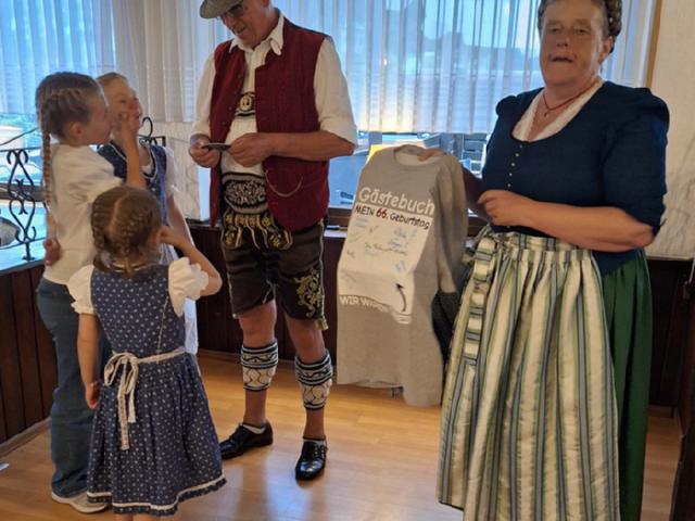Im Verlauf des gemütlichen Abends wurde noch von Seiten der Aubinger Trachtler gratuliert und ein Präsentkorb übergeben Die Familie des Geburtstagsjubilars hatte ein T-Shirt vorbereitet, auf dem zunächst Familie, die Aktiven und Kinder, aber auch alle Anwesenden unterschreiben konnten. Die gemütliche Geburtstagsfeier dauerte noch bis spät in die Nacht an.